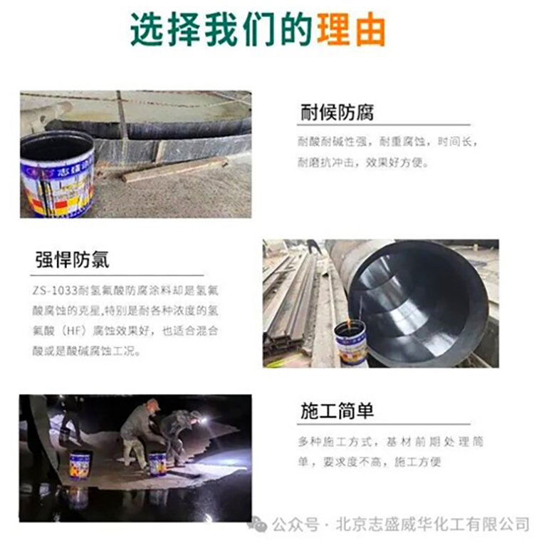 北京志盛威华ZS-1033耐氢氟酸防腐涂料是一种专为强腐蚀环境设计的高性能防腐涂料,具有优异的耐酸、耐化学介质、耐湿热和耐氟化物腐蚀性能。其独特的成膜技术和分子结构使其能够在多种基材表面形成致密、牢固的保护层,有效隔离腐蚀介质与基体接触,延长设备设施的使用寿命。