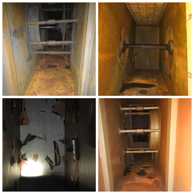 我相信很多用过RTO的厂家和做RTO设备的厂家都深有感触,RTO下箱体底部是腐蚀最恶劣的关键部位,也就是蓄热室的下方,进气、排气和吹扫阀门的位置,比如三室RTO的平推阀附近以及平推阀下面的底板,因为这里是常温进气、高温排气以及高温吹扫共用的区域,也就是造成了这个区域的防腐涂层要一直经历高低温交替、酸性冷凝液与高温腐蚀气体交替、干湿交替、有机废气与无机废气交替。